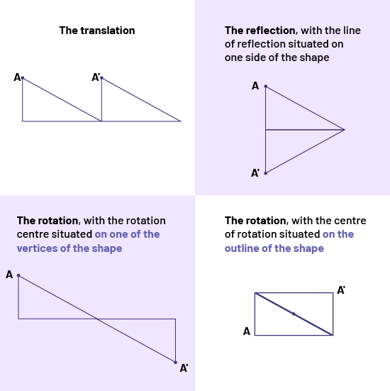 Image An example of transfer, with a right-angled triangle that has shifted to the right. An example of reflection, with a right triangle that has become an acute isosceles triangle. The reflection, with an axis of reflection located on one side of the figure. The rotation, with the center of rotation located on one of the vertices of the figure. A right triangle is extended on the right, but the second one is upside down. The rotation with the center of rotation located on the outline of the figure. A rectangle is composed of two right-angled triangles.