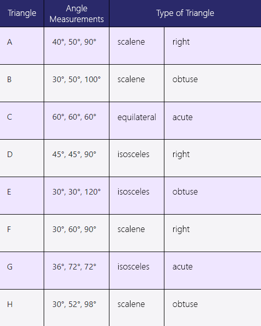 Image a table labeled: “the triangle”, “the measurements”, and the “type of triangle”. Triangle "A" 40 degrees, 50 degrees, 90 degrees, right-angled scalene triangle. Triangle "B", 30 degrees, 50 degrees, 100 degrees, obtuse scalene triangle. Triangle " C ", 60 degrees, 60 degrees, 60 degrees, equilateral triangle, equi-angle and acutangle. Triangle "D". 45 degrees, 45 degrees, 90 degrees, right isosceles triangle. Triangle "E", 30 degrees, 30 degrees, 120 degrees, isosceles triangle, obtuse triangle. Triangle "F", 30 degrees, 60 degrees, 90 degrees, scalene triangle, acutangle. Triangle "G", 36 degrees, 72 degrees, isosceles triangle, acutangle. Triangle "H" 30 degrees, 52 degrees, 98 degrees, scalene triangle, obtuse angle. |