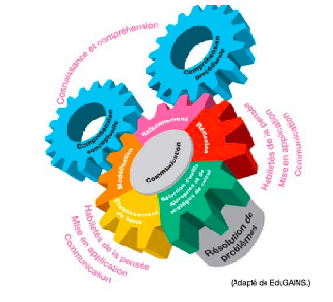 image Infographie. Un engrenage est placé sur un axe nommé « résolution de problèmes ». La roue d’engrenage, qui est sur cet axe, est divisée en 5 parties : la réflexion ; sélection d’outils appropriés et de stratégies de calcul ; établissement de liens ; modélisation ; et raisonnement. Le tout atournant autour de la communication. Ces cinq éléments permettent : les habiletés de la pensée, la mise en application et la communication. Sur les engrenages, modélisation et raisonnement, on retrouve une autre roue de compréhension conceptuelle, et une roue de compréhension procédure. Ce qui apportera la connaissance et compréhension. Source : Guide d’enseignement efficace des mathématiques, de la 7e à la 10e année, p. 7-9.