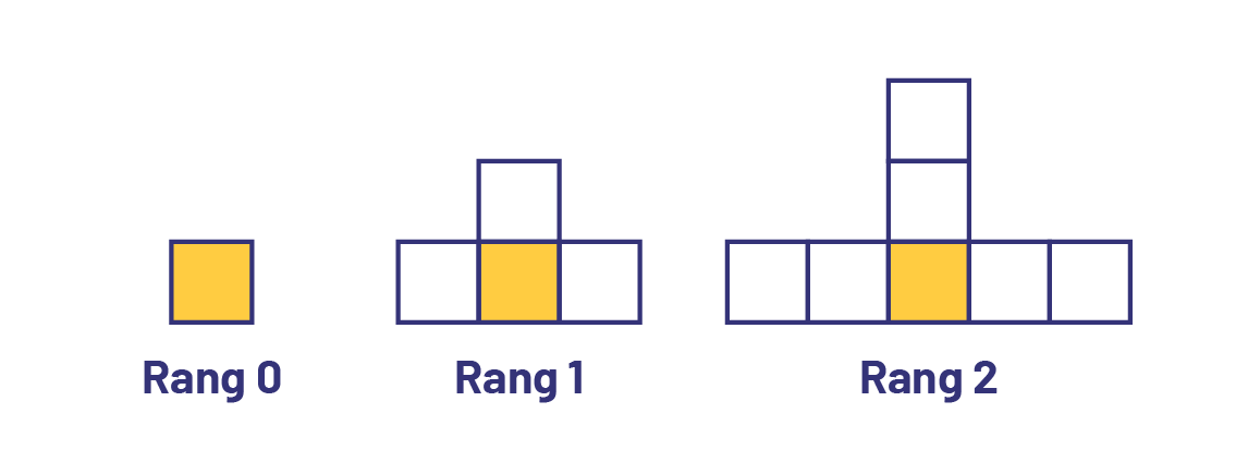 image Un exemple de raisonnement algébrique abstrait sur les carrés. Rang zéro : un carré jaune. Rang un : un carré jaune et un carré blanc sur le dessus, à droite et à gauche. Rang 2: un carré jaune, deux carrés blancs superposés verticalement et deux carrés blancs de chaque côté. | Niveau d'abstraction | Réflexion de l’élève |