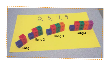 Les élèves observent également la relation entre le numéro indiquant le rang et le nombre de cubes afin d’en arriver à une règle : nombres de cubes = numéro du rang × 2 + 1. Dans ce cas, c’est une règle composée d’un multiplicateur (partie qui fait croître la suite) et d’une constante. Cette règle leur permet de faire des prédictions lointaines.