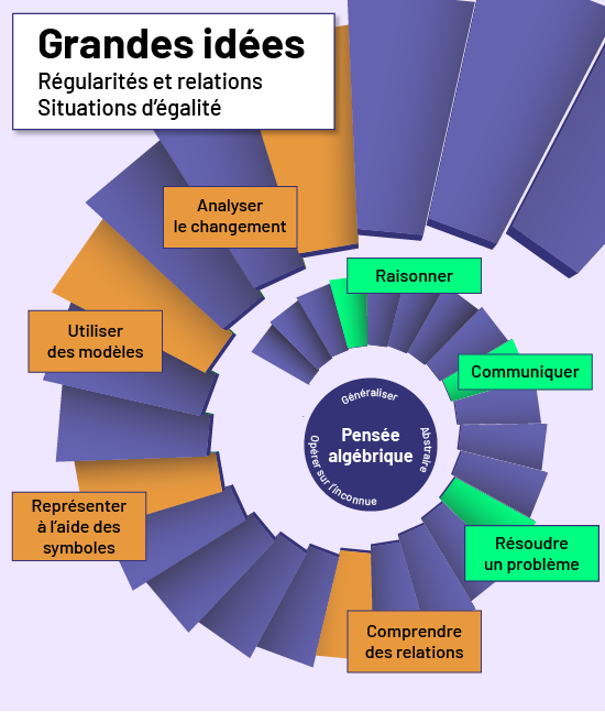Les attentes et les contenus d’apprentissage en algèbre font appel à un grand nombre de concepts. Le regroupement de ces concepts sous de grandes idées favorise la planification d’une programmation plus efficace de l’enseignement. Ce faisant, le personnel enseignant est en mesure d’élaborer des situations d’apprentissage cohérentes qui permettent aux élèves :