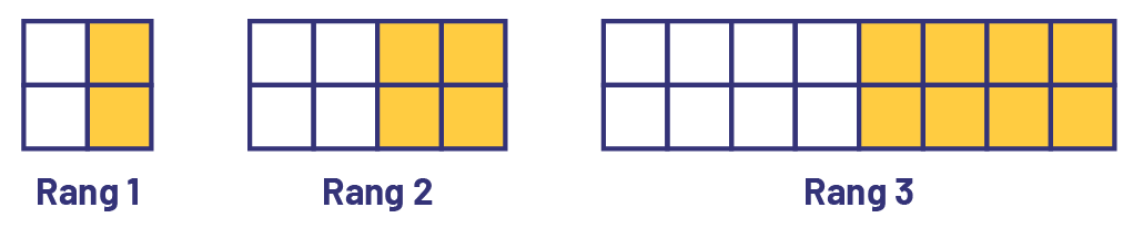 image Suite croissante non numérique avec des carrés. Rang un : 2 carrés blancs superposés et 2 carrés jaunes superposés. Rang 2 : 2 carrés blancs superposés répétés 2 fois et 2 carrés jaunes superposés répétés 2 fois. Rang 3 : 2 carrés blancs superposés répétés 4 fois et 2 carrés jaunes superposés répétés 4 fois. Des élèves pourront même constater que le nombre de carrés qui composent une figure est égal à 2 × 2 × 2 × … × 2, où le nombre de multiplications est égal au rang de la figure.