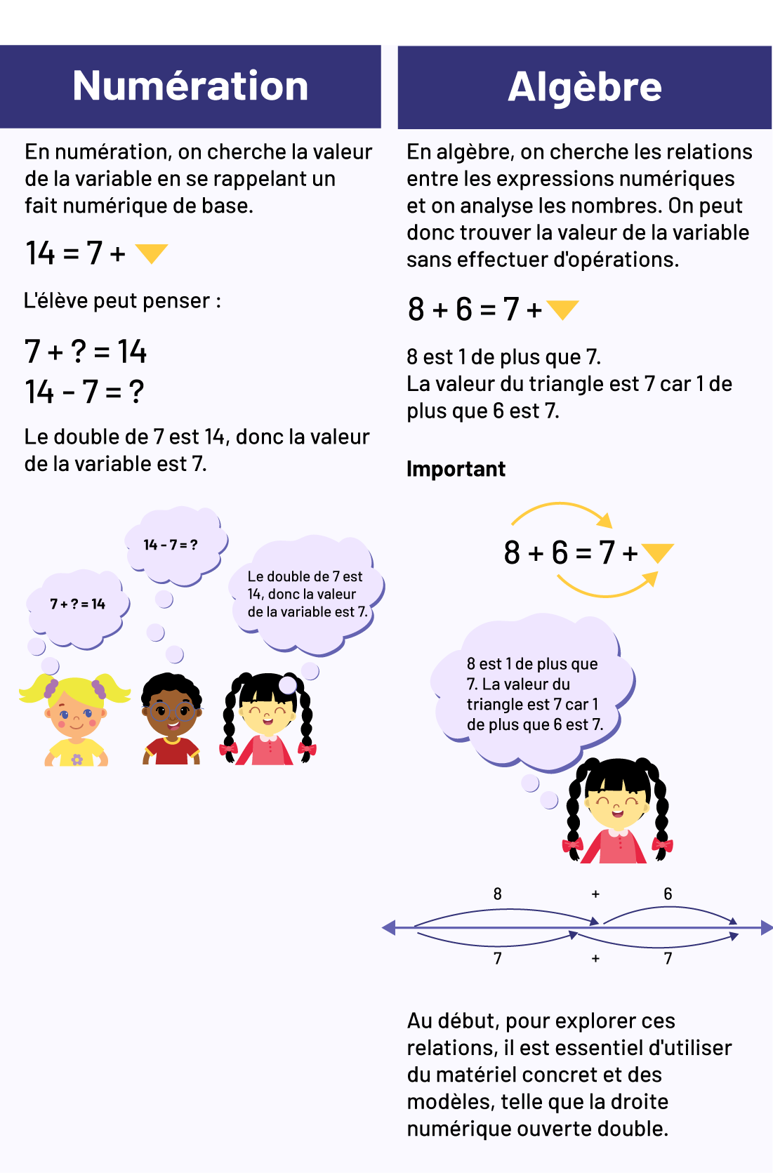 image Le tableau ci-dessous montre la principale distinction entre le raisonnement arithmétique et le raisonnement algébrique. En numération, nous cherchons la valeur de l'inconnue en nous souvenant d'un fait numérique de base. 14 égal 7 plus triangle. L'élève peut penser : 7 plus point d’interrogation, égal 14. 14 moins 7 égal point d’interrogation. Le double de 7 est 14, donc la valeur de l'inconnue est de 14. En algèbre, on recherche des relations entre les expressions numériques et on analyse les nombres. On peut trouver la valeur de l'inconnue sans effectuer d'opérations. 8 plus 6 égale 7 plus triangle. Huit est un de plus que 7. La valeur du triangle est 7, car un de plus que 6 est 7. Important: 8 plus 6 égal 7 plus triangle. Dans la bulle : 8 est un de plus que 7. La valeur du triangle est 7, car un de plus que 6 est 7. Au début, pour explorer ces relations, il est essentiel d'utiliser du matériel concret et des modèles, tel que la droite numérique ouverte double. Source : L’@telier - Ressources pédagogiques en ligne (atelier.on.ca).