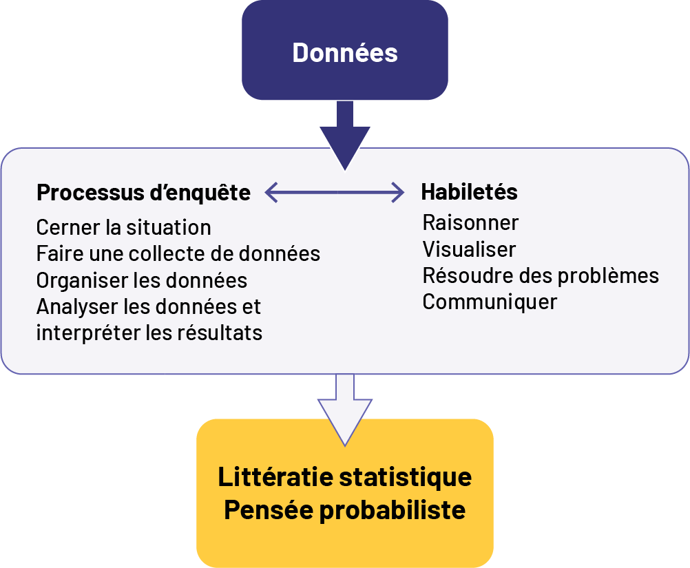 image Premier encadré : Données Flèche pointant vers un autre encadré regroupant deux titres reliés par un droite avec une flèche à chaque extrémité : Processus d’enquête et Habiletés Sous Processus d’enquête : Cerner la situation Faire une collecte de données Analyser les données et interpréter les résultats Sous Habiletés : Raisonner Visualiser Résoudre des problèmes Communiquer Flèche qui part de cet encadré vers un autre encadré comprenant les titres suivants : Littératie statistique Pensée probabiliste.Source : Guide d’enseignement efficace des mathématiques, de la 4e à la 6e année, p. 5-7.