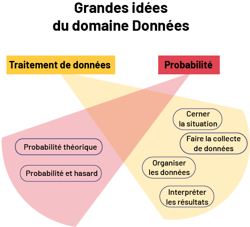 image Le schéma s’intitule « Grandes idées du domaine Données ». L’expression « Traitement de données » est surlignée en orange. À côté, le mot « Probabilité » est surligné de rouge. De chacun d’eux se déploie un faisceau lumineux de la même couleur. Dans le faisceau orange, les quatre expressions suivantes sont encerclées : « Cerner la situation. Faire la collecte de données. Organiser les données. Interpréter les résultats. » Dans le faisceau rouge, les deux expressions suivantes sont encerclées : « Probabilité théorique. Probabilité et hasard. »APERÇU