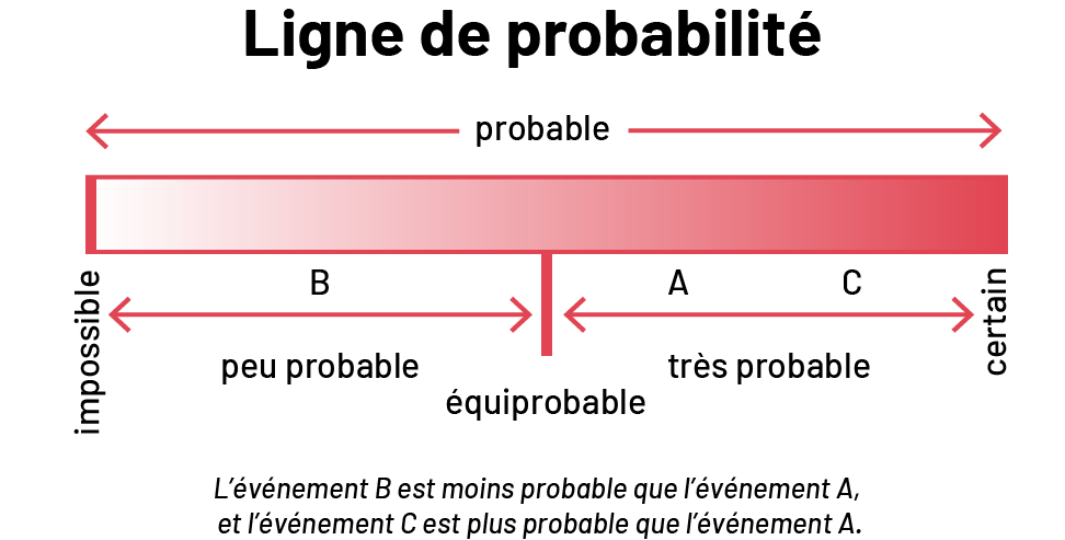 image La ligne de probabilité présente une barre partant du blanc et devenant graduellement rouge. Au-dessus de la barre, il est écrit « Probable », avec deux flèches pointant vers les extrêmes de la barre. À l’extrême gauche de la barre, il est écrit impossible. Au centre de la barre, il est écrit équiprobable. Entre la gauche et le centre, il est écrit peu probable. À l’extrême droite, il est écrit certain. Entre équiprobable et certain, il est écrit très probable. Dans la partie gauche de la barre, il y a la lettre « B ». Dans la partie droite de la barre, il y a la lettre « A » à gauche, et la lettre « C » à droite. Sous la barre, il est écrit : « L’événement B est moins probable que l’événement A, et l’événement C est plus probable que l’événement A. »Le diagramme en arbre est un moyen efficace de visualiser l’ensemble des résultats possibles d’une expérience.