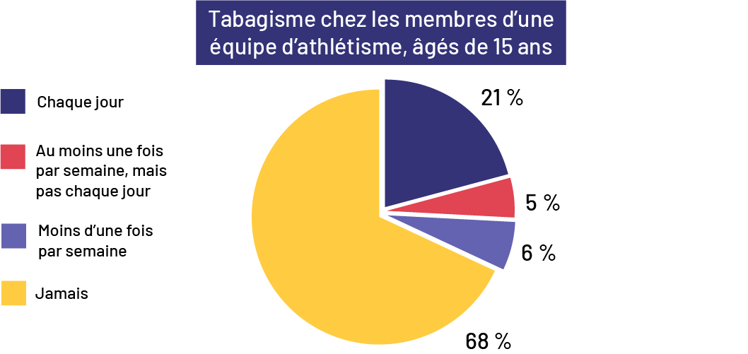 Le personnel enseignant présente les données liées au tabagisme et concernant les membres d’une équipe d’athlétisme, âgés de 15 ans. Ils créent un diagramme circulaire pour représenter ces données. Il demande aux élèves d’utiliser ce diagramme pour déterminer la probabilité qu’un membre de cette équipe fume aujourd’hui. (Si l’on compare les pourcentages 68 % et 6 %, qui correspondent respectivement à « jamais » et à « moins d’une fois par semaine », et les pourcentages 21 % et 5 %, correspondant respectivement à « chaque jour » et à « au moins une fois par semaine », on constate que la probabilité qu’un membre fume aujourd’hui est de 26 % et qu’un membre ne fume pas est de 74 %. On peut donc prédire que, si l’on rencontre aujourd’hui un membre de cette équipe, la probabilité qu'il fume est d’environ ¼ et celle qu'il ne fume pas est de ¾.)