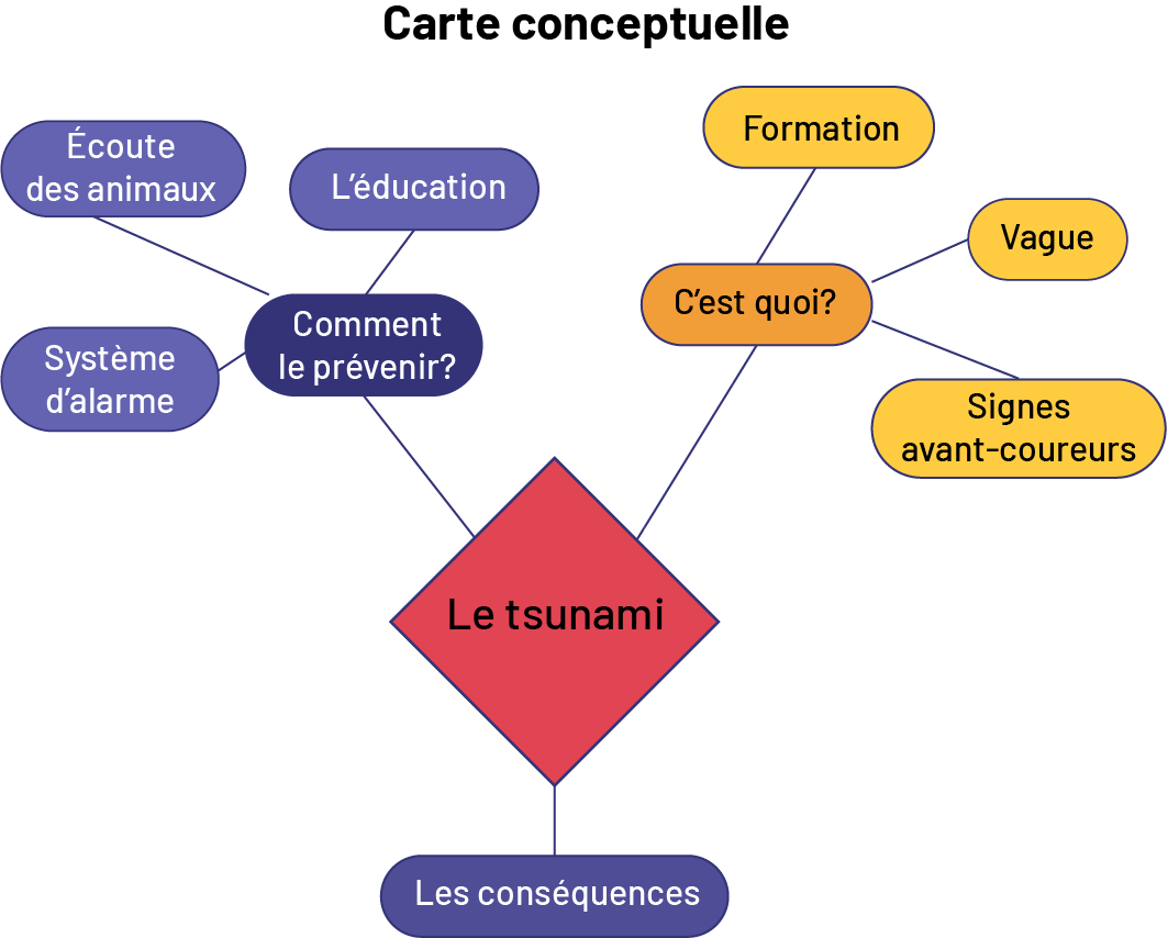 image La carte conceptuelle commence avec l’expression « Le tsunami », placée dans un carré rouge. Trois branches le relient à trois ensembles d’éléments. D’abord, elle est reliée à une bulle dans laquelle il est écrit « Comment le prévenir? ». Celle-ci se lie aux éléments suivants : « Système d’alarme. Écoute des animaux. L’éducation. » La deuxième branche se lie à une bulle dans laquelle il est écrit : « C’est quoi? ». Celle-ci se lie aux éléments suivants : « Formation. Vague. Signes avant-coureurs. » Enfin, sa troisième branche se lie à une bulle isolée, dans laquelle il est écrit : « Les conséquences ».