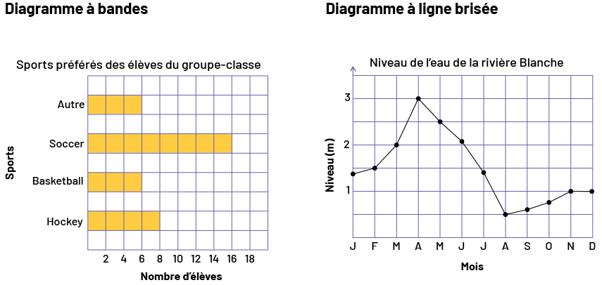 image1 Un diagramme quadrillé à bandes horizontales s’intitule « Sports préférés des filles du groupe-classe ». L’axe horizontal se nomme « Nombre d’élèves », tandis que l’axe vertical se nomme « Sports ». Pour le hockey, la bande remplit quatre cases. Pour le Basketball, la bande remplit trois cases. Pour le soccer, la bande remplit huit cases. Et pour autre, la bande remplit trois cases.image2 Le diagramme à ligne brisée à points reliés s’intitule « Niveau de l’eau de la rivière Blanche ». L’axe horizontal se nomme « Mois » tandis que l’axe vertical, gradué de zéro à trois, se nomme « Niveau en mètres ». À la lettre J, le point se situe légèrement au-dessus d’un. À la lettre F, le point se situe à un et demi. À la lettre M, le point se situe à deux. À la lettre A, le point se situe à trois. À la lettre M, le point se situe à deux et demi. À la lettre J, le point se situe au-dessus de deux. À la lettre J suivante, le point se situe entre un et un et demi. À la lettre A, le point se situe à un demi. À la lettre S, le point se situe sous le chiffre un. À la lettre O, le point se situe légèrement plus près du chiffre un. À la lettre N et à la lettre D, le point se situe à un.Le modèle de partage équitable, utilisé pour déterminer une moyenne, illustre aussi la façon dont l’habileté à visualiser aide à mieux comprendre un concept abstrait. En probabilité, la ligne de probabilité constitue un moyen visuel efficace pour comprendre le concept de probabilité et comparer la probabilité de deux événements.