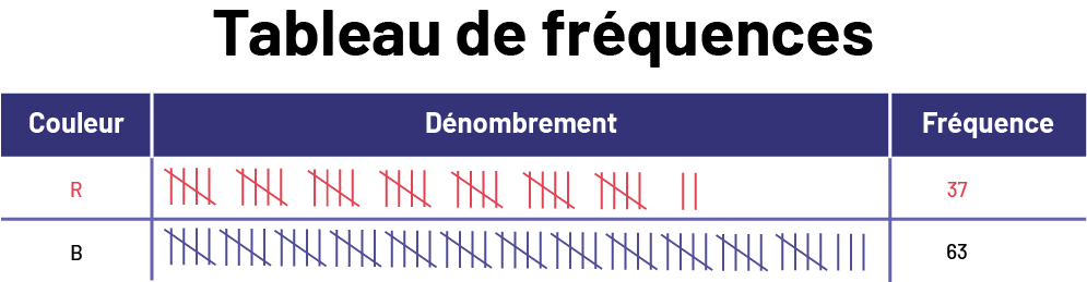 image Le tableau de fréquences possède trois colonnes : Couleur, dénombrement et fréquence. Pour la couleur rouge, on dénombre 5 ensembles de 5 traits et deux traits seuls. Il est écrit 37 sous Fréquence. Pour la couleur bleue, on dénombre 12 ensembles de 5 traits et 3 traits seuls. Il est écrit 63 sous Fréquence.D’après les données représentées dans ce tableau, les élèves pourraient conclure que, dans leur sac, il y a environ 20 jetons rouges et 30 jetons bleus.