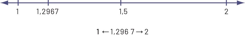 droite numérique est graduée d’un à deux, avec intervalle de zéro virgule cinq. Sous un virgule cinq, le nombre 1,2967