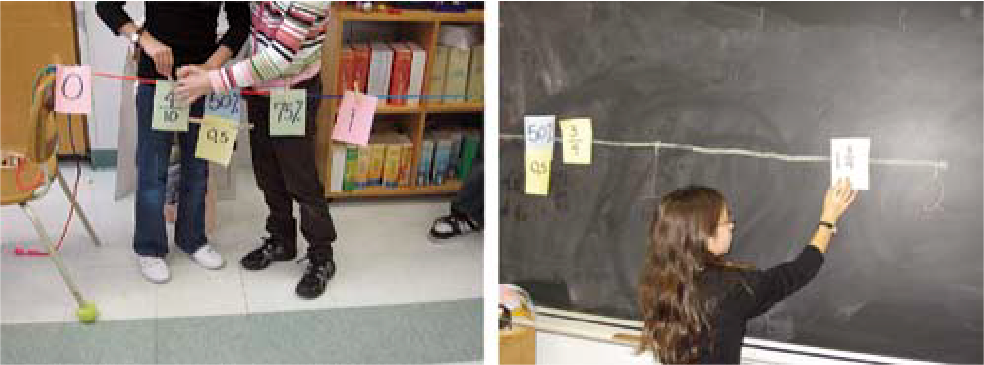 Inscrire des fractions, des nombres fractionnaires, des nombres naturels et des nombres décimaux sur des cartes éclair. Placer deux cartes sur une corde à linge (ou sur une droite numérique). Demander à un ou à une élève de venir choisir au hasard une carte éclair et de la placer sur la corde à linge (ou la droite numérique) en tenant compte de l’ordre et de l’espace entre les nombres. Lorsque l’élève place sa carte, il ou elle doit justifier son choix d’emplacement et répondre aux questions qui peuvent lui être posées. Poursuivre l’activité en invitant tour à tour d’autres élèves à effectuer la même démarche.