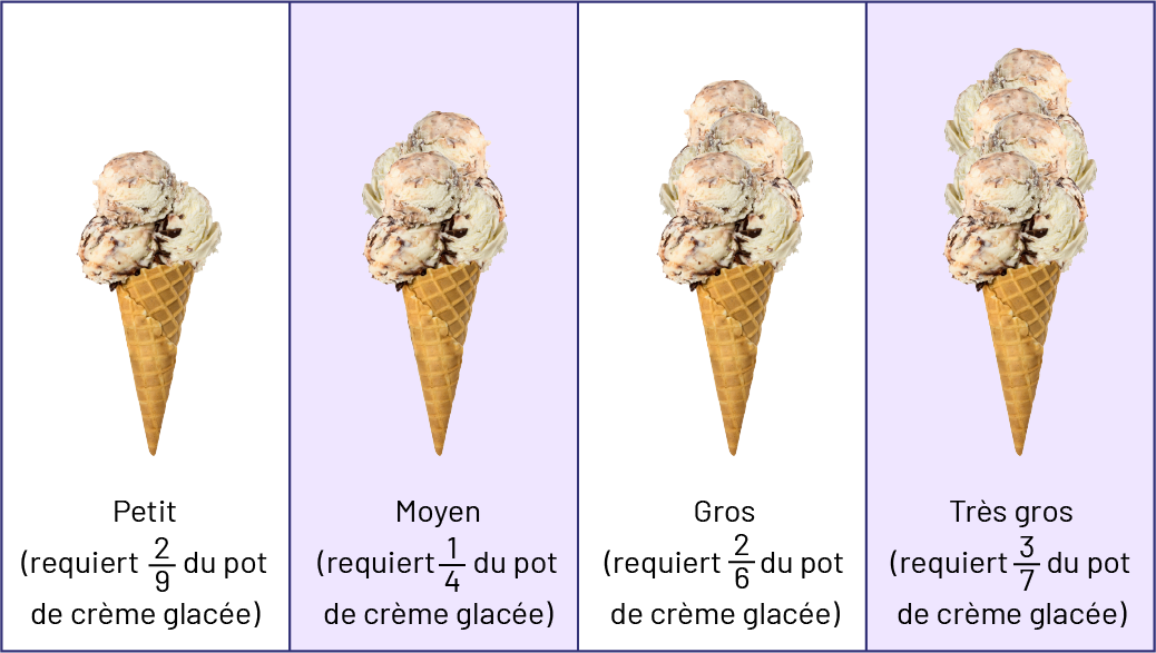 Image Quatre cornets de crème glacée sont alignés du plus petit au plus gros. Le premier cornet est considéré petit. On mentionne qu’il requiert deux neuvièmes du pot de crème glacée. Le deuxième cornet est considéré moyen. On mentionne qu’il requiert un quart du pot de crème glacée Le troisième cornet est considéré gros. Il requiert deux sixièmes du pot de crème glacée. Et le quatrième cornet est considéré très gros. Il requiert trois septièmes du pot de crème glacée.