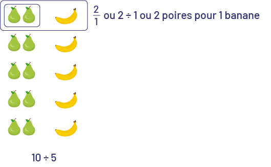 - 10 poires pour 5 bananes ou 10 : 5 ou \(\frac{{10}}{5}\) ou 2