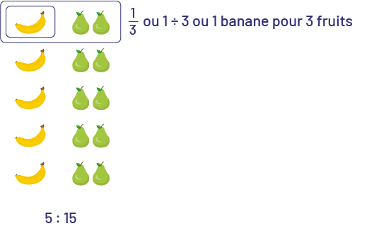 - 5 bananes pour 15 fruits ou 5 : 15 ou \(\frac{5}{{15}}\) ou \(\frac{1}{3}\)