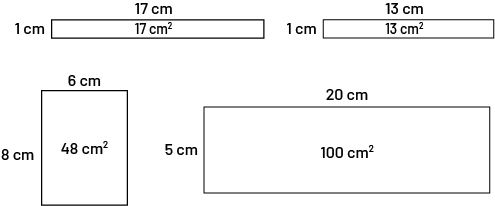 Image Quatre rectangles sont présentés. Le premier mesure un centimètre par 17 centimètres pour un total de 17 centimètres carrés. Le deuxième mesure un centimètre par 13 centimètres pour un total de 13 centimètres carrés. Le troisième mesure huit centimètres par six centimètres pour un total de 48 centimètres carrés. Et le quatrième mesure cinq centimètres par vingt centimètres pour un total de cent centimètres carrés.