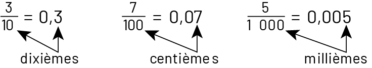 cinq sur mille égale zéro virgule zéro zéro cinq. Avec des flèches, le mot « millièmes » pointe vers le mille de cinq