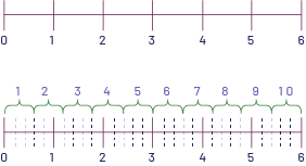 Image Deux droites numériques graduées de zéro à six sont placées l’une sous l’autre. La première ne présente que les chiffres de zéro à six. La deuxième les présente aussi mais possède également des marques d’intervalles de zéro virgule deux en pointillé. Au-dessus, l'accolade un regroupe zéro à zéro virgule six. L’accolade deux regroupe zéro virgule six à un virgule deux. L’accolade trois regroupe un virgule deux à un virgule huit. L’accolade quatre regroupe un virgule huit à deux virgule quatre. L’accolade cinq regroupe deux virgule quatre à trois. L’accolade six regroupe trois à trois virgule six. L’accolade sept regroupe trois virgule six à quatre virgule deux. L’accolade huit regroupe quatre virgule deux à quatre virgule huit. L’accolade neuf regroupe quatre virgule huit à cinq virgule quatre. Et l’accolade dix regroupe cinq virgule quatre à six.