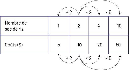 Pour 10 sacs de riz, le coût sera de 50 $. 10 sacs c’est 5 fois plus que 2, donc le prix est 5 fois plus que 10 $.