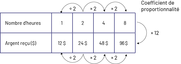 Image Un tableau indique dans une rangée le nombre d’heures, et dans une autre rangée, l’argent reçu en dollars. Nombre d’heures : un, deux, quatre, huit. Une flèche va de deux à un en indiquant divisé par deux. Une flèche va de deux à quatre en indiquant fois deux. Une flèche va de quatre à huit en indiquant fois deux. Argent reçu : douze dollars, 24 dollars, 48 dollars, 96 dollars. Une flèche va de 24 à douze en indiquant divisé par deux. Une flèche va de 24 à 48 en indiquant fois deux. Une flèche va de 48 à 96 en indiquant fois deux. Et une flèche va de la première à la deuxième rangée en indiquant fois douze. À droite du tableau il est écrit : Coefficient de proportionnalité. Un tableau de rapports peut aussi être construit sans que les valeurs soient inscrites dans un ordre croissant ou sans que toutes les valeurs soient inscrites. Il est en effet parfois plus facile de trouver la solution au problème en utilisant la relation de proportionnalité comme le démontre l’exemple suivant.