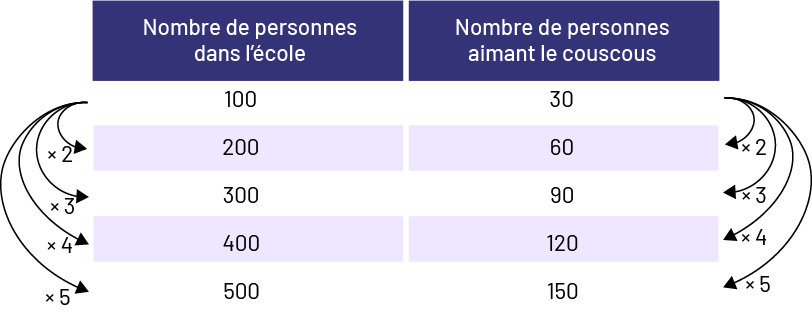 Image Un tableau indique, dans sa première colonne, le nombre de personnes dans l’école, et dans sa deuxième colonne, le nombre de personnes aimant le couscous. Nombres de la première colonne : cent, 200, 300, 400, 500. Une flèche va de cent à 200 en indiquant fois deux. Une flèche va de cent à 300 en indiquant fois trois. Une flèche va de cent à 400 en indiquant fois quatre. Et une flèche va de cent à 500 en indiquant fois cinq. Nombres de la deuxième colonne : 30, 60, 90, 120, 150. Une flèche va de 30 à 60 en indiquant fois deux. Une flèche va de 30 à 90 en indiquant fois trois. Une flèche va de 30 à 120 en indiquant fois quatre. Et une flèche va de 30 à 150 en indiquant fois cinq.