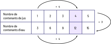 Image Un tableau horizontal possède deux rangées correspondant respectivement au nombre de contenants de jus et au nombre de contenants d’eau. Nombre de contenants de jus : un, deux, trois, quatre, cinq. Une flèche relie un à quatre en indiquant fois quatre. Nombre de contenants d’eau : trois, six, neuf, douze, quinze. Une flèche relie trois à douze en indiquant fois quatre. Les cases correspondant à quatre et à douze sont violettes tandis que les autres sont blanches. Une flèche relie la première rangée à la deuxième en indiquant fois trois.