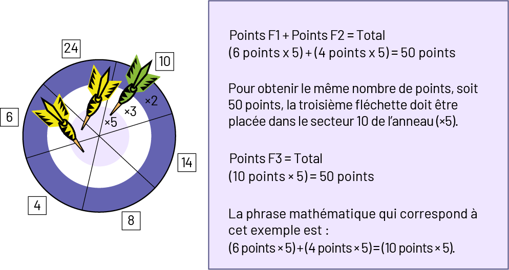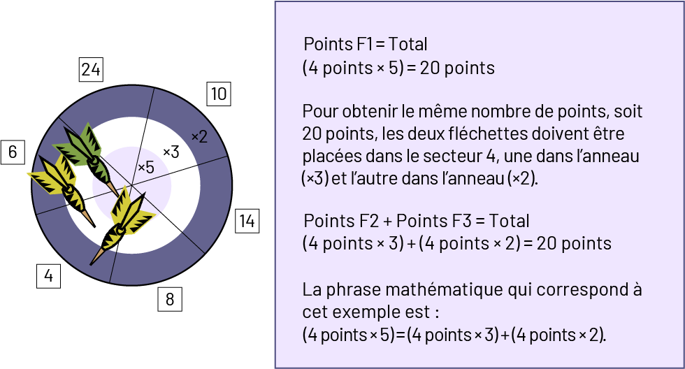 Afin de consolider le concept de distributivité, présenter une combinaison acceptable pour la situation 4, qui permet d’établir une relation d’égalité entre les points générés par une fléchette et la somme des points obtenus par deux autres fléchettes, mais qui ne respecte pas la propriété de distributivité de la multiplication sur l’addition. Les élèves doivent saisir le sens de la distributivité puisque dans le jeu qu’ils créeront ultérieurement, le respect de cette propriété fera partie des règles du jeu.
