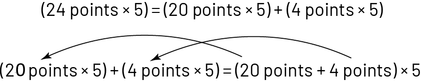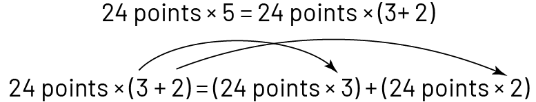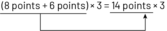 Phrase mathématique : \(\left( {8\;\;{\rm{points}}\; \times \;{\rm{3}}} \right)\; + \;\left( {6\;\;{\rm{points}}\; \times \;{\rm{3}}} \right)\; = \;14\;\;{\rm{points}}\; \times \;{\rm{3}}\)