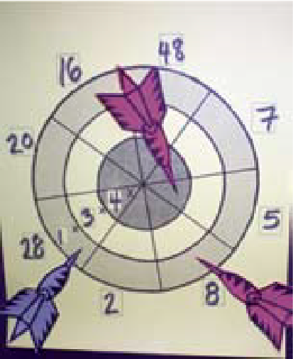 Présenter l’annexe 6.2 au tableau interactif ou la reproduire au tableau et la décrire (voir annexe 6.1). Préciser aux élèves que ce jeu est différent du jeu de fléchettes traditionnel.