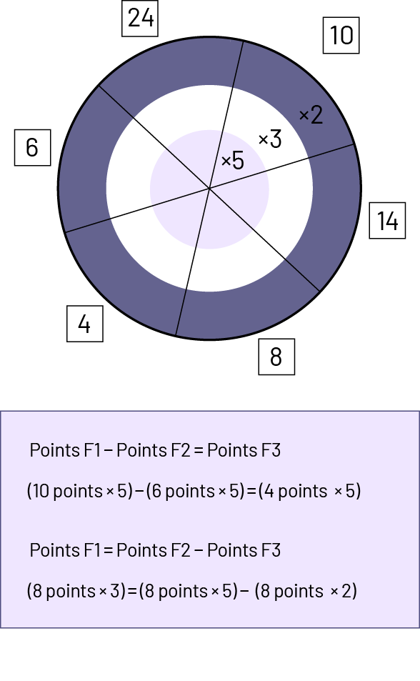 Pour la situation 4 de l’annexe 6.4, les élèves doivent ajouter les points manquants dans trois des secteurs de la cible; pour ce faire, ils doivent tenir compte du nombre de points générés par la fléchette placée dans le secteur 24 de l’anneau (\( \times \;5\)).