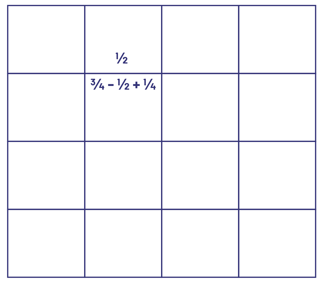 carré est divisé en 16 carrés égaux. Dans le deuxième carré de la première rangée, il est écrit un demi. Et dans le