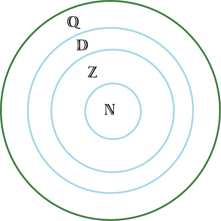 L’ensemble des nombres rationnels inclut tous les nombres qui peuvent être exprimés sous forme fractionnaire (\(\frac{a}{b}\)). Il inclut les nombres naturels, les nombres entiers et les nombres décimaux, ainsi que les nombres dont l’expression décimale est infinie et périodique (par exemple, \(\frac{1}{3}\; = \;0,333\;33 \ldots \; = \;0, \overline 3;\;\frac{5}{{11}}\; = \;0,454\;545 \ldots \) = \(0, \overline {45}\)). On peut représenter la relation entre les ensembles de nombres par le diagramme de Venn ci-dessous.