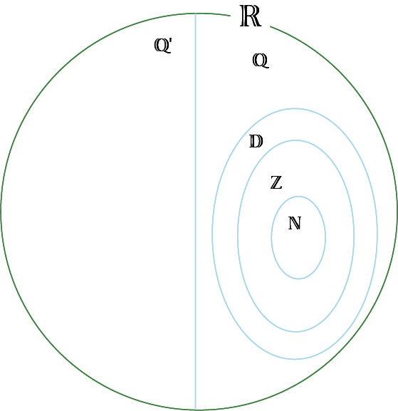 Image Un grand cercle vert représente les nombres réels. Il est divisé en deux parties égales par une