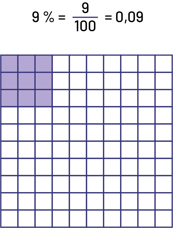 écrit : neuf pourcent égale neuf sur cent égale zéro virgule zéro neuf.