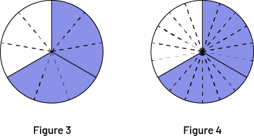 La fraction qui représente \(\frac{1}{4}\) correspond au nombre de parties coloriées 2 fois, soit \(\frac{2}{{12}}\). Le numérateur correspond aux parties coloriées plus foncées et le dénominateur correspond au nombre de parties de même taille dans le tout, soit 12 parties.