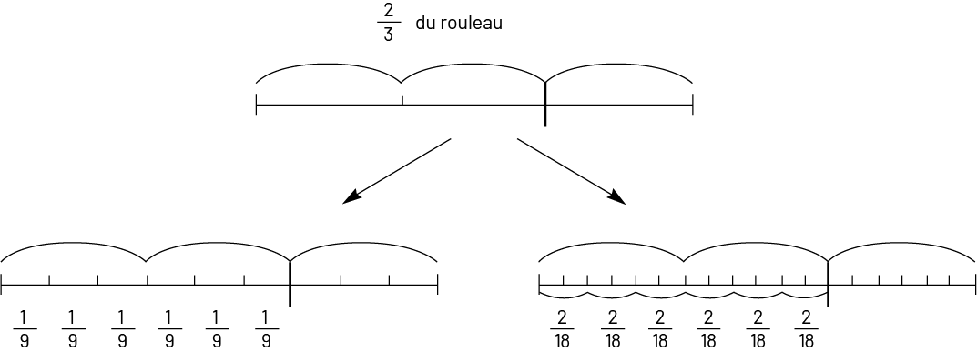 Ainsi, on peut déterminer que chacune des 6 sections correspond à \(\frac{1}{9}\) ou \(\frac{2}{{18}}\) du rouleau de corde.