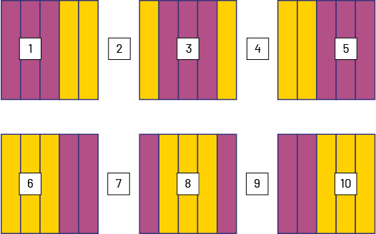 rectangles verticaux. Premier carré : Les trois premiers rectangles sont pourpres et les deux autres sont jaunes. Le