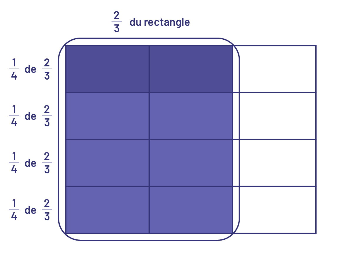 \(\frac{1}{4}\;\;\;{\rm{de}}\;\;\;\frac{2}{3}\;{\rm{du \;\;\; rectangle}}\; = \frac{2}{{12}}\;\;\;{\rm{ou}}\;\;\;\frac{1}{6}\)