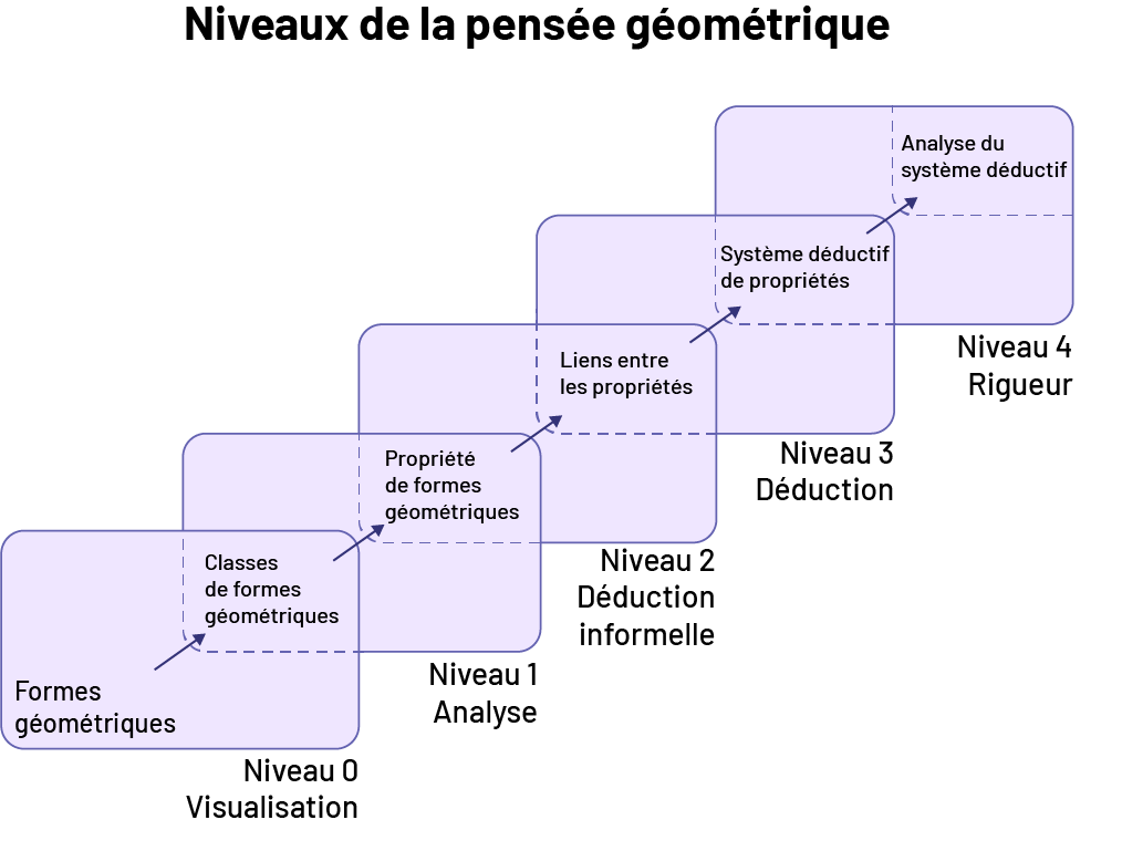 Depuis plusieurs années, des études dans le domaine de la géométrie ont eu une influence importante sur l’enseignement des concepts en géométrie. À la suite de recherches poussées, deux chercheurs hollandais, Dina Van Hiele-Geldof et Pierre Van Hiele, ont conçu un modèle du développement de la pensée géométrique. L’élément clé de ce modèle est une hiérarchie à cinq niveaux décrivant la compréhension des concepts en géométrie à différentes étapes du développement de la pensée de l’élève.