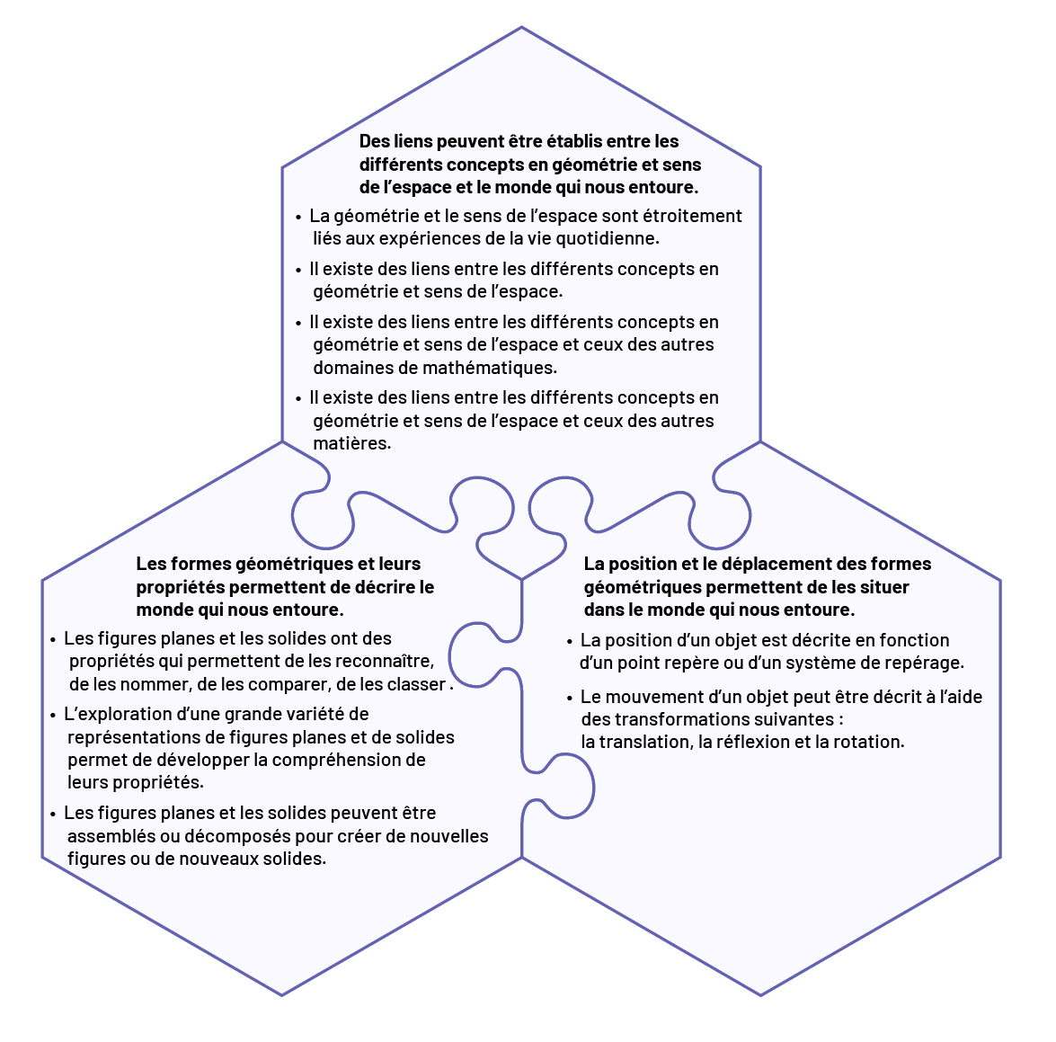 image 3 morceaux de casse-têtes sont imbriqués les uns avec les autres. Chaque morceau contient de l’information.Morceau un : des liens peuvent être établis entre les différents concepts en géométrie et sens de l’espace et le monde qui nous entoure.La géométrie et le sens de l’espace sont étroitement liés aux expériences de la vie quotidienne.Il existe des liens entre les différents concepts de géométrie et sens de l’espace.Il existe des liens entre les différents concepts en géométrie et le sens de l’espace et ceux des autres domaines en mathématique.Il existe des liens entre les différents concepts en géométrie et sens de l’espace et ceux des autres matières.Dans le deuxième morceau : La position et le déplacement des formes géométriques permettent de les situer dans le monde qui nous entoure.La position d’un objet est décrite en fonction d’un point repère ou d’un système de repérage.Le mouvement d’un objet peut être décrit à l’aide des transformations suivantes : la translation, la réflexion, la rotation.Le troisième morceau : Les formes géométriques et leurs propriétés permettent de décrire le mode qui nous entoure.Les figures planes et les solides ont des propriétés qui permettent de les reconnaître, de les nommer, de les comparer, de les classer.L’exploration d’une grande variété de représentations de figures planes et de solides permet de développer la compréhension de leurs propriétés.Les figures planes et les solides peuvent être assemblés ou décomposés pour créer de nouvelles figures ou de nouveaux solides.Source : Guide d'enseignement efficace des mathématiques de la 1re à la 3e année, p. 9-10.