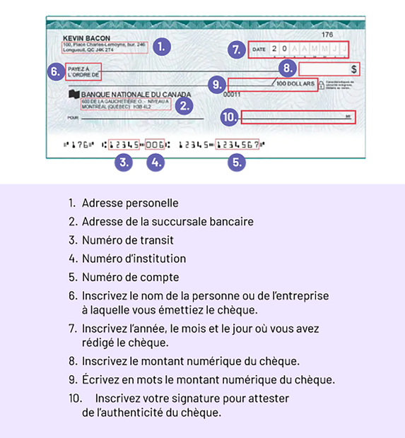 Image Un spécimen de chèque : En haut à gauche : l’adresse personnelle. Au milieu à gauche : l’adresse de la succursale bancaire. En bas du chèque : numéro de transit, numéro d’institution et numéro de compte. Emplacement pour inscrire le nom de la personne ou de l’entreprise à laquelle on émet le chèque. En haut à droite : inscrire la date, le mois, et le jour où le chèque est rédigé. Sous la date, inscrire le montant numérique du chèque. Au milieu du chèque, le montant en lettres. En bas à droite : inscrivez votre signature pour attester de l’authenticité du chèque.
