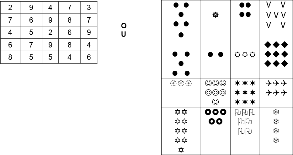 image Deux grilles sont présentées. Entre les deux, il y a les lettres « O » et « U » superposées. La première grille est chiffrée; elle est constituée de cinq colonnes et cinq rangées. Les chiffres dans les cases vont comme suit : deux, neuf, quatre, sept, trois. Sept, six, neuf, huit, sept. Quatre, cinq, deux, six, neuf. Six, sept, neuf, huit, quatre. Huit, cinq, cinq, quatre, six. La deuxième grille, possédant quatre colonnes et cinq lignes, est constituée de symboles. Les contenus des cases vont respectivement comme suit : cinq jetons noirs, un gouvernail, quatre jetons noirs, sept lettres « V ». Six jetons noirs, deux jetons noirs, trois soleils, neuf losanges noirs. Trois fleurs, sept binettes, neuf étoiles à six branches, six avions. Neuf étoiles de David, cinq boulons, sept drapeaux, quatre flocons.