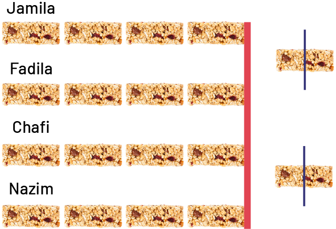 image Chacun accompagné d’un ensemble de quatre barres tendres, les noms Jamila, Fadila, Chafi et Nazim sont écrits l’un sous l’autre. Un trait rouge relie tous les ensembles de quatre barres tendres. À côté du trait, il y a deux barres tendres divisées en deux parts égales par un trait bleu.