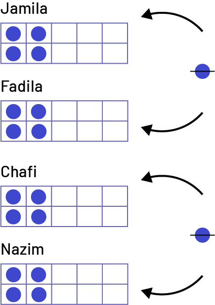 image Les prénoms Jamila, Fadila, Chafi et Nazim, placés l’un sous l’autre, sont respectivement associés à une grille composée de deux rangées de cinq cases. Il y a quatre jetons dans chacune des grilles. Entre les prénoms Jamila et Fadila, il y a un jeton séparé en deux par un trait, duquel deux flèches pointent respectivement vers les prénoms Jamila et Fadila. Entre les prénoms Chafi et Nazim, il y a un jeton séparé en deux par un trait, duquel deux flèches pointent respectivement vers les prénoms Chafi et Nazim.