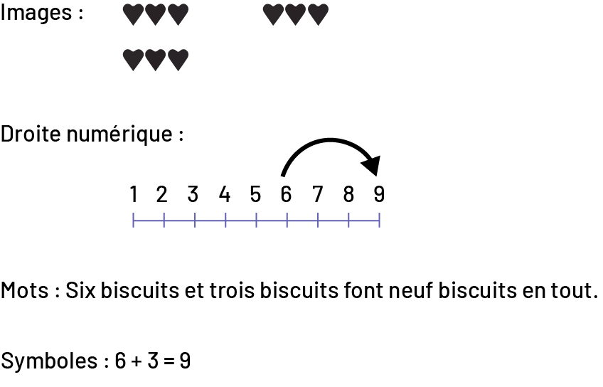 image À côté du mot « Images », il y a trois ensembles de trois cœurs noirs.À côté de l’expression « Droite numérique », il y a une droite numérotée d’un à neuf. Une flèche courbe part du chiffre six et pointe vers le neuf.À côté du terme « Mots », il y a la phrase suivante : Six biscuits et trois biscuits font neuf biscuits en tout.À côté du mot « Symboles », on trouve l’équation suivante : six plus trois égale neuf.