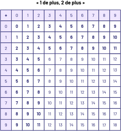 image Au-dessus de la grille onze par onze, il est écrit « un de plus, deux de plus ». Dans le coin en haut à gauche, il y a le symbole plus. Les colonnes et les rangées se chiffrent respectivement de zéro à neuf. La rangée et la colonne zéro se chiffrent de zéro à neuf. La rangée et la colonne un se chiffrent d’un à dix. La rangée et la colonne deux se chiffrent de deux à onze. La rangée et la colonne trois se chiffrent de trois à douze. La rangée et la colonne quatre se chiffrent de quatre à treize. La rangée et la colonne cinq se chiffrent de cinq à 14. La rangée et la colonne six se chiffrent de six à 15. La rangée et la colonne sept se chiffrent de sept à 16. La rangée et la colonne huit se chiffrent de huit à 17. Et la rangée et la colonne neuf se chiffrent de neuf à 18.Les chiffres des colonnes et des rangées de zéro à deux inclusivement sont en caractères gras.