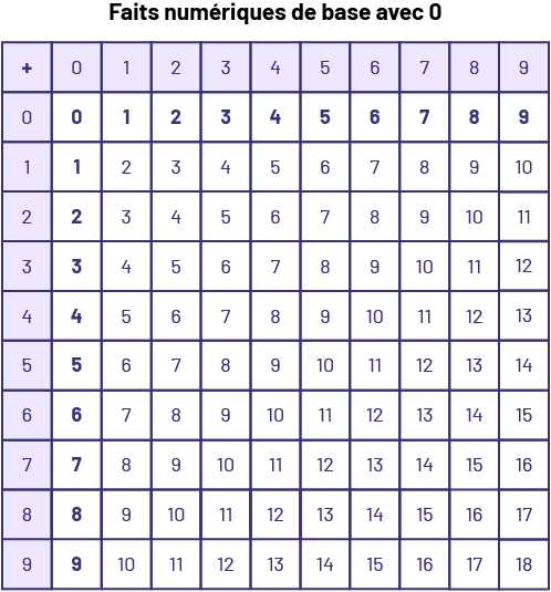 image La grille chiffrée s’intitule Faits numériques de base avec zéro.Dans le coin en haut à gauche, il y a le symbole plus. Les colonnes et les rangées se chiffrent respectivement de zéro à neuf. La rangée et la colonne zéro se chiffrent de zéro à neuf. La rangée et la colonne un se chiffrent d’un à dix. La rangée et la colonne deux se chiffrent de deux à onze. La rangée et la colonne trois se chiffrent de trois à douze. La rangée et la colonne quatre se chiffrent de quatre à treize. La rangée et la colonne cinq se chiffrent de cinq à 14. La rangée et la colonne six se chiffrent de six à 15. La rangée et la colonne sept se chiffrent de sept à 16. La rangée et la colonne huit se chiffrent de huit à 17. Et la rangée et la colonne neuf se chiffrent de neuf à 18.Les chiffres de la colonne et de la rangée zéro sont en caractères gras.