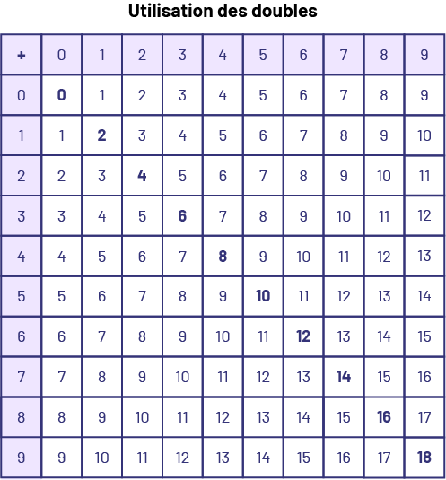 image La grille chiffrée s’intitule Utilisation des doubles. Dans le coin en haut à gauche, il y a le symbole plus. Les colonnes et les rangées se chiffrent respectivement de zéro à neuf. La rangée et la colonne zéro se chiffrent de zéro à neuf. La rangée et la colonne un se chiffrent d’un à dix. La rangée et la colonne deux se chiffrent de deux à onze. La rangée et la colonne trois se chiffrent de trois à douze. La rangée et la colonne quatre se chiffrent de quatre à treize. La rangée et la colonne cinq se chiffrent de cinq à 14. La rangée et la colonne six se chiffrent de six à 15. La rangée et la colonne sept se chiffrent de sept à 16. La rangée et la colonne huit se chiffrent de huit à 17. Et la rangée et la colonne neuf se chiffrent de neuf à 18.Tous les chiffres suivant la diagonale à partir de zéro sont en caractères gras.
