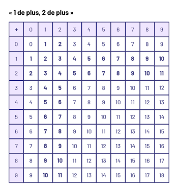 image Au-dessus de la grille onze par onze, il est écrit « un de plus, deux de plus ». Dans le coin en haut à gauche, il y a le symbole plus. Les colonnes et les rangées se chiffrent respectivement de zéro à neuf. La rangée et la colonne zéro se chiffrent de zéro à neuf. La rangée et la colonne un se chiffrent d’un à dix. La rangée et la colonne deux se chiffrent de deux à onze. La rangée et la colonne trois se chiffrent de trois à douze. La rangée et la colonne quatre se chiffrent de quatre à treize. La rangée et la colonne cinq se chiffrent de cinq à 14. La rangée et la colonne six se chiffrent de six à 15. La rangée et la colonne sept se chiffrent de sept à 16. La rangée et la colonne huit se chiffrent de huit à 17. Et la rangée et la colonne neuf se chiffrent de neuf à 18.